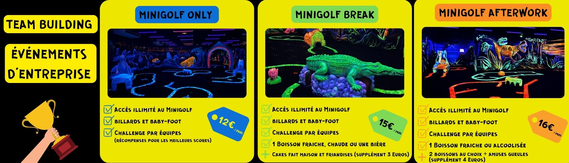 Un parcours de minigolf indoor sur 450m²en lumière noire sur le thème des espèces menacées et des dinosaures. Entrez dans un univers unique et fantastique avec des décors en 3D fluorescents.
