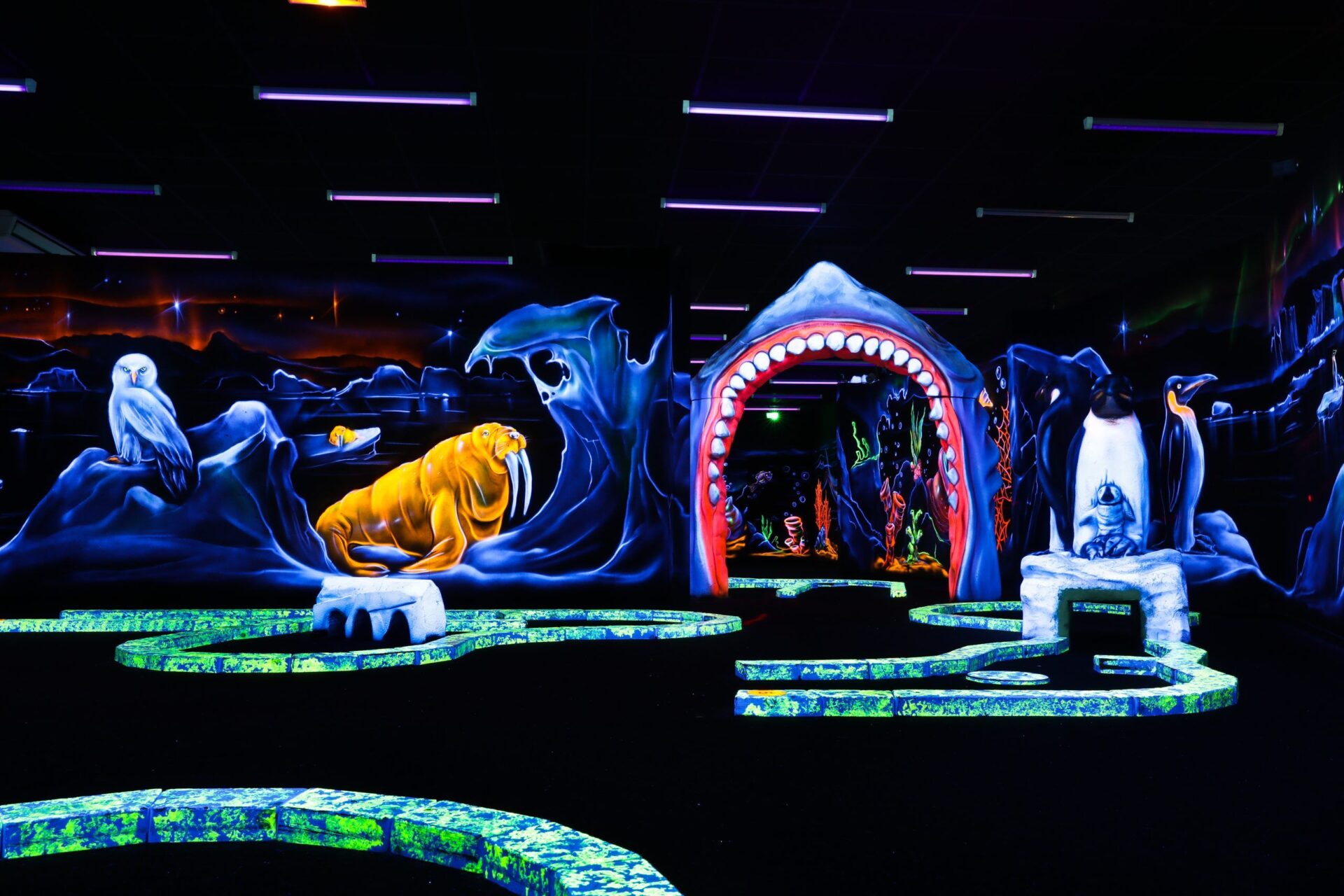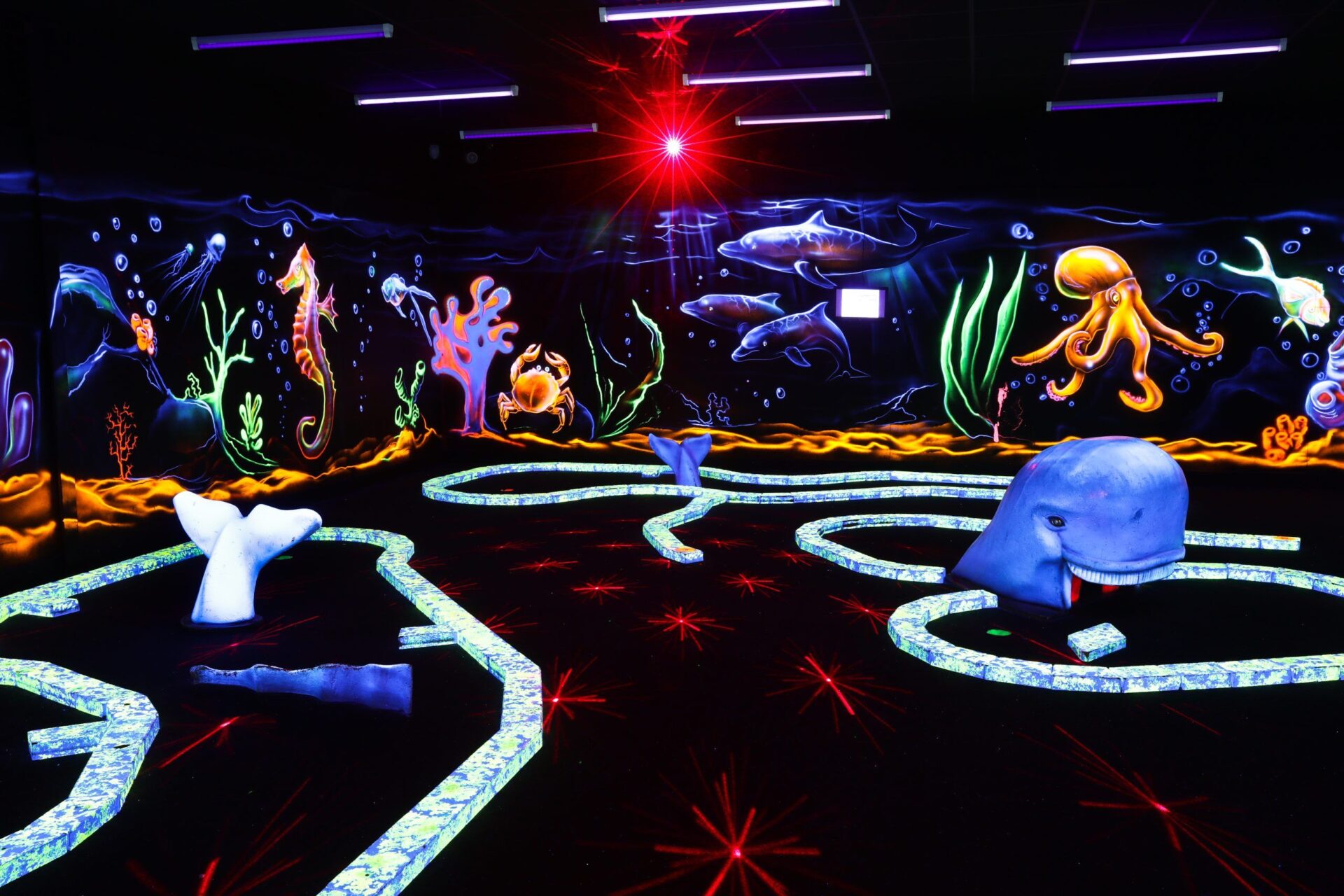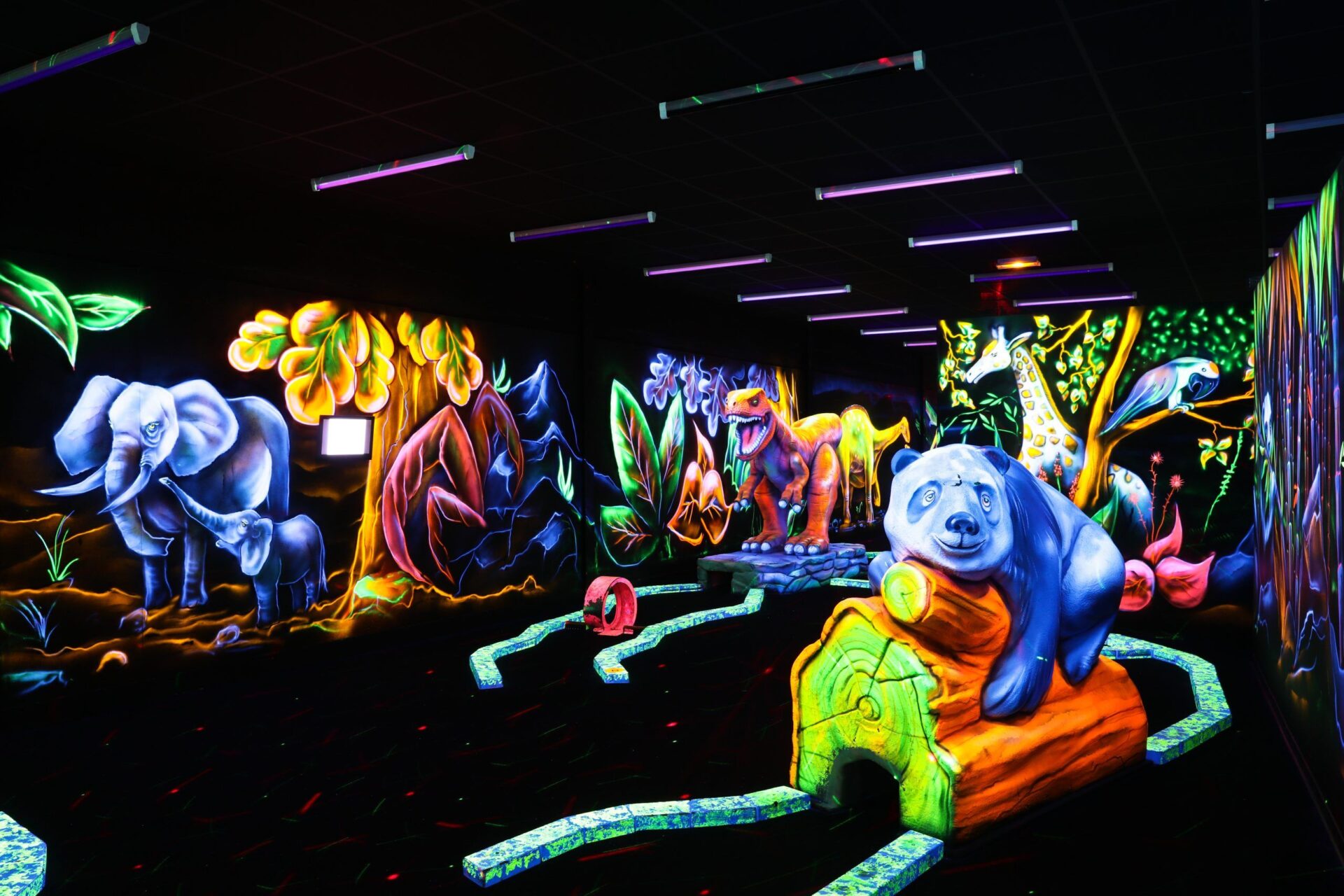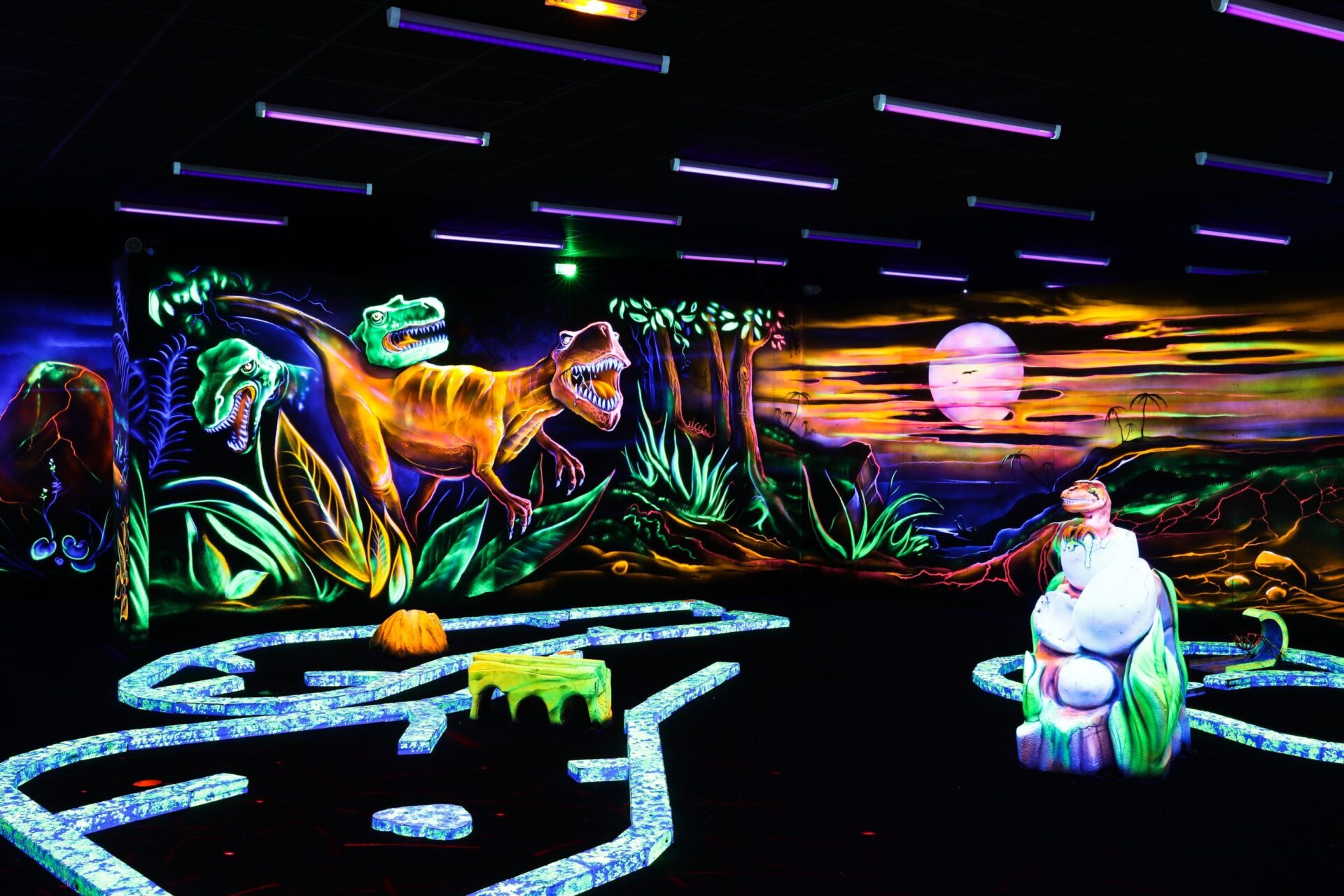 Un parcours de minigolf indoor sur 450m²en lumière noire sur le thème des espèces menacées et des dinosaures. Entrez dans un univers unique et fantastique avec des décors en 3D fluorescents.